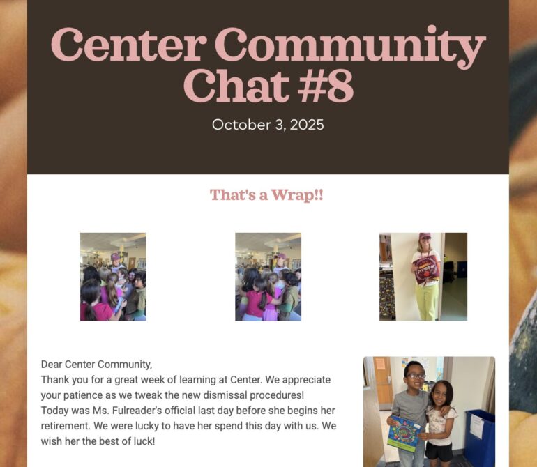 Center Elementary School Community Chat: Oct. 3, 2025 Posted October 3rd, 2025 in Newsletters Center Elementary School Community Chat Back Issues 2025-26 Oct. 3, 2025 Sept. 26, 2025 Sept. 19, 2025 Sept. 12, 2025 Sept. 5, 2025 Aug. 28, 2025 Aug. 19, 2025 Aug. 14, 2025